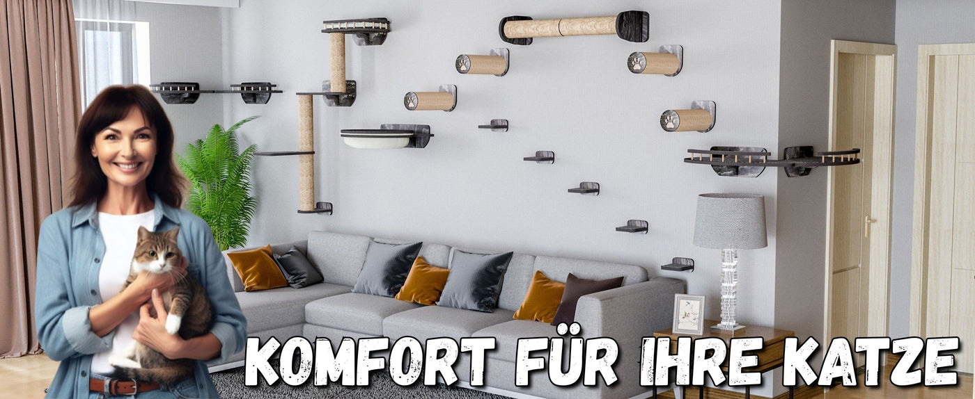 Kombinieren Sie dieses Set mit unseren Katzenwandregalen oder Katzenhängebrücken, um einen kompletten Katzenwandspielplatz zu schaffen, der auf Ihr Zuhause und die Bedürfnisse Ihrer Katze zugeschnitten ist.