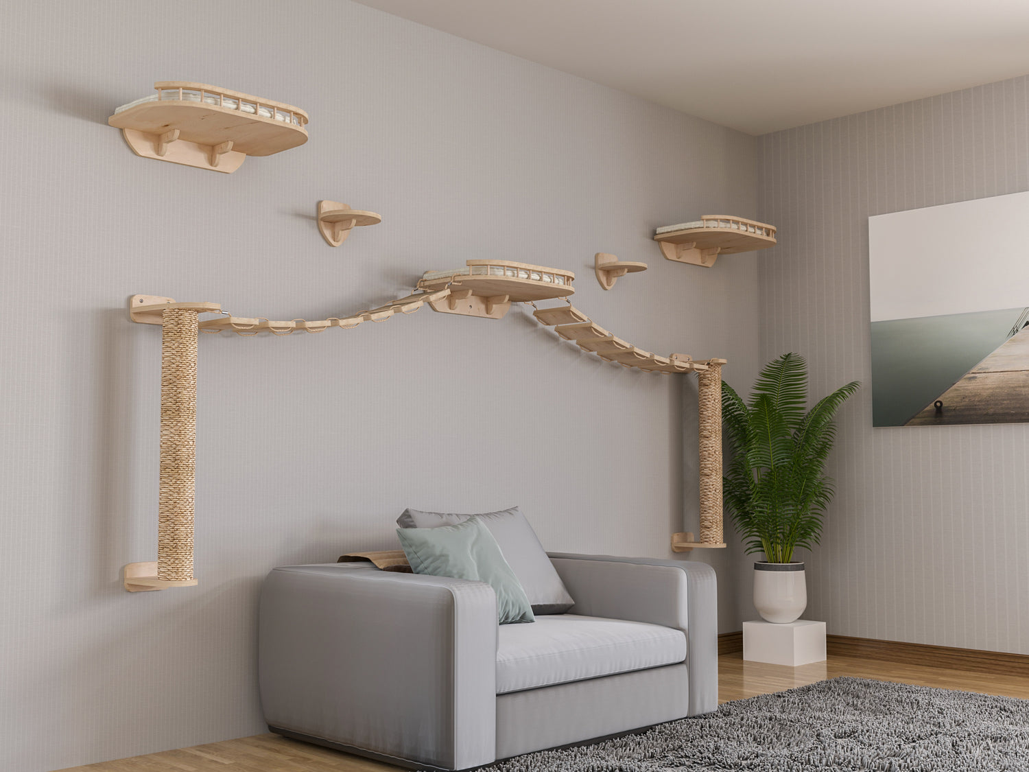 Dieses wandmontierte Möbelset von RshPets vereint Komfort, Aktivität und natürliches Design – perfekt für Haushalte mit mehreren Katzen oder für Katzen, die gerne klettern und die Welt von oben beobachten.