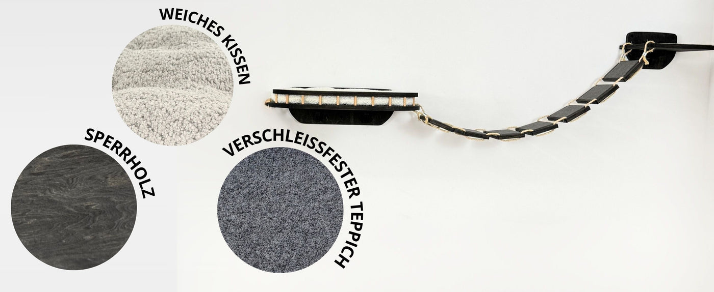 • HIGH-QUALITY MATERIALS: The cat bridge is made of 15 mm thick plywood. A soft, non-slip carpet is attached to the cat bridge, cat shelf and bed, giving your cat a safe, secure and comfortable feeling. The bridge elements are connected with natural sisal ropes. All wooden elements are treated with high-quality wood oil.