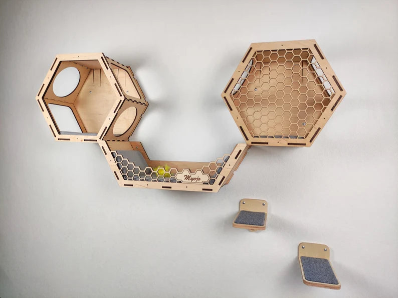 💫Our wall-mounted cat furniture is the perfect solution for creating a cozy place for your pet to relax. Hexagonal shelves, a cat bed and spacious hexagonal steps increase the space for your cat. Each shelf is designed with your cat's needs for comfort and safety in mind.