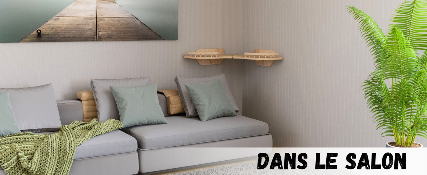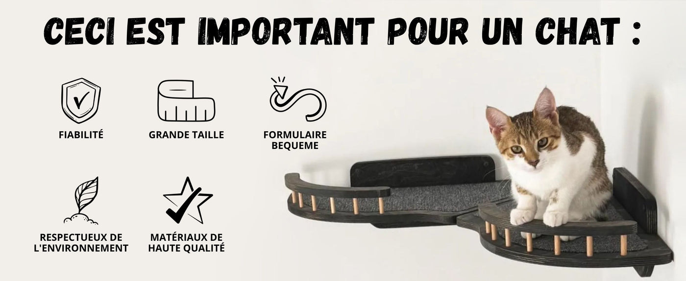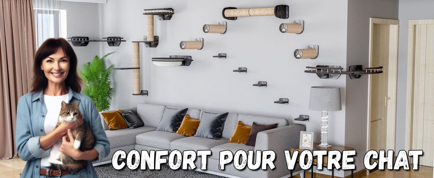 Découvrez notre gamme demarches murales et de griffoirs pour compléter cette étagère, créant un environnement chaleureux, élégant et attrayant que votre chat adorera absolument !