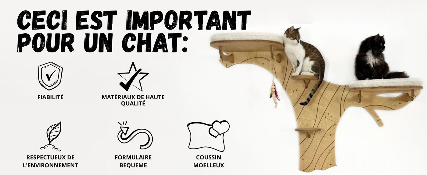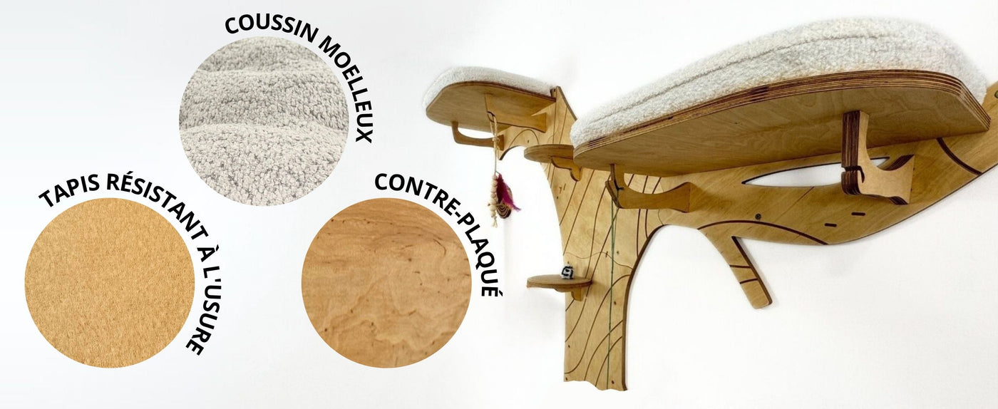 Créez un véritable paradis félin sur votre mur avec notre système d'escalade modulaire inspiré des arbres. Ce meuble vertical pour chat allie esthétique et fonctionnalité, offrant à votre animal des zones de repos douillettes, des parcours d'escalade sécurisés et des coussins moelleux. Fabriqué en contreplaqué de bouleau durable de 15 mm, chaque meuble est traité avec une huile écologique et s'intègre parfaitement aux intérieurs modernes. Les coussins fixés par velcro sont faciles à nettoyer et les marches recouvertes de moquette assurent une bonne prise en main. Grâce à sa construction modulaire, l'installation et la personnalisation sont simples, ce qui en fait un produit idéal pour ceux qui apprécient la flexibilité et le style.