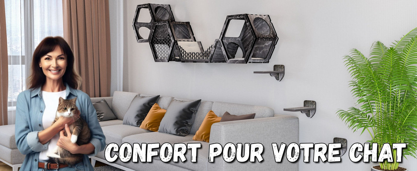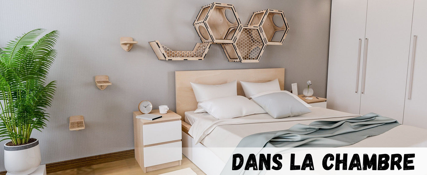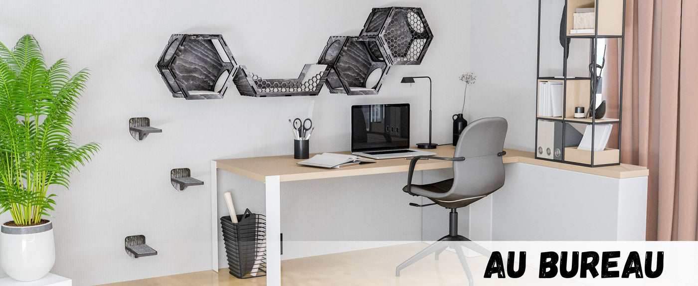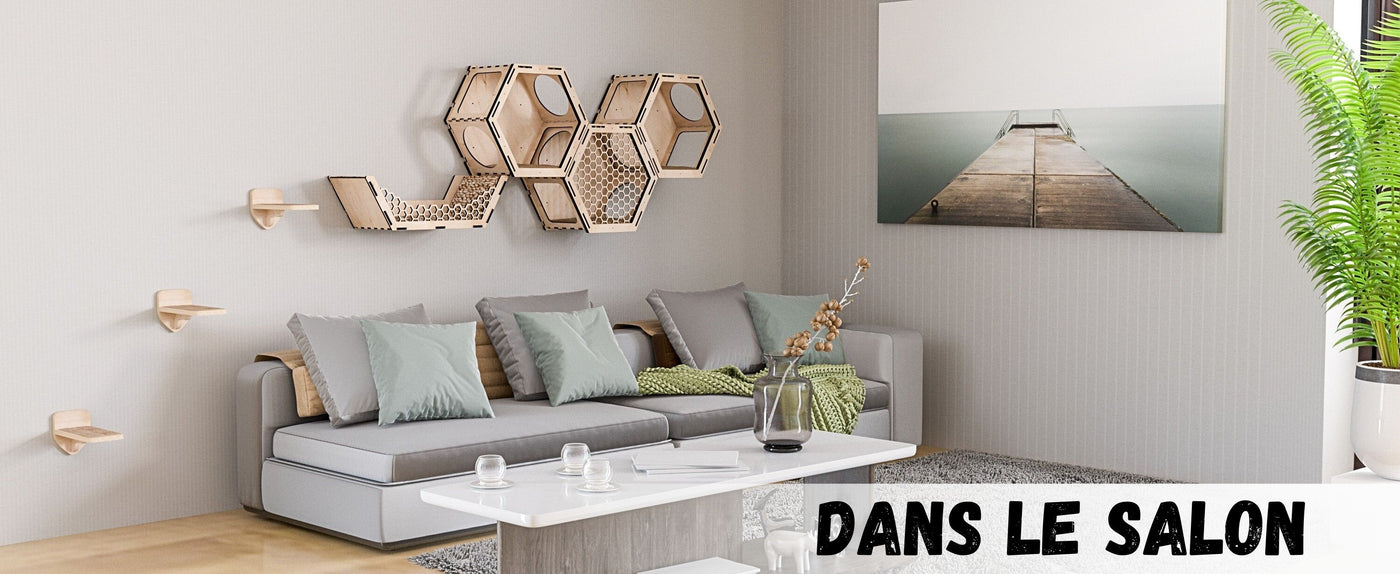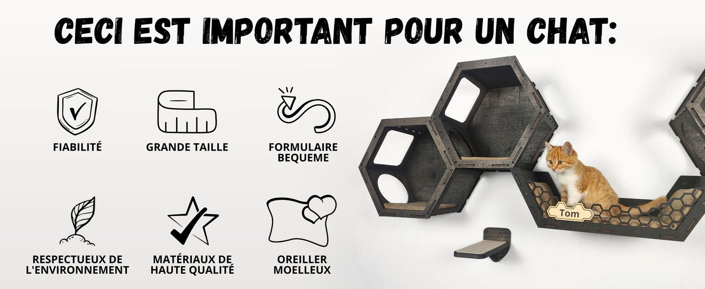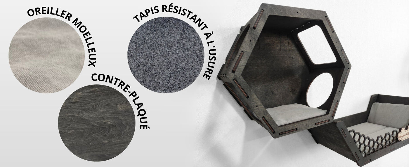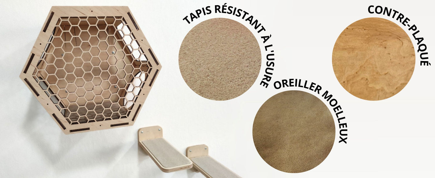 Le meuble mural pour chat Hexagon est la solution idéale pour créer un espace de détente confortable pour votre animal. Des étagères hexagonales, un panier et de larges marches hexagonales offrent un espace supplémentaire à votre chat. Chaque étagère est conçue pour répondre à ses besoins de confort et de sécurité.