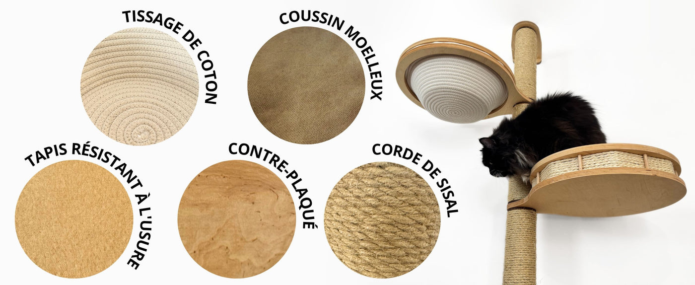 Une marche en bois stratégiquement placée permet à votre chat de se déplacer en hauteur en toute sécurité et de manière ludique. Tous les éléments sont solidement fixés au mur pour gagner de la place et protéger vos meubles des griffures. Fabriqué avec de la corde en sisal de haute qualité, du contreplaqué de bouleau et des paniers en coton respirant, cet ensemble est une solution élégante et sans danger pour les animaux.