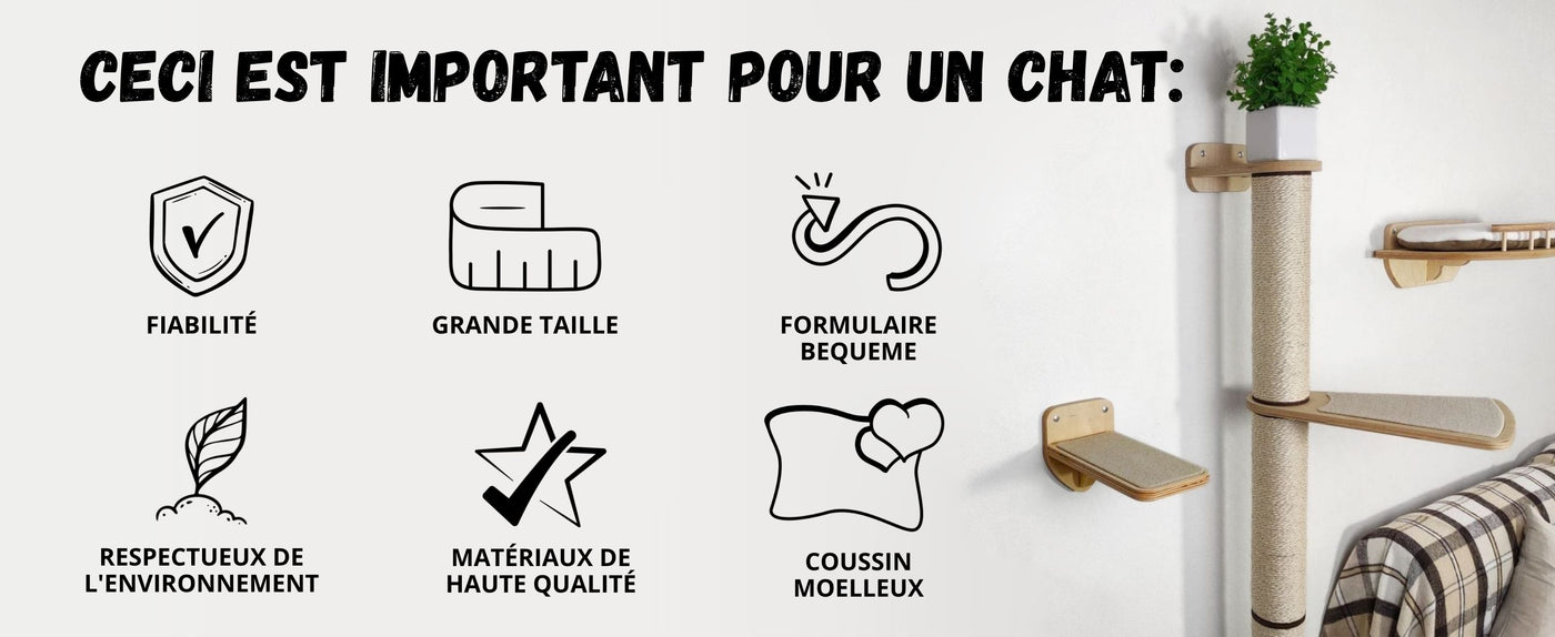 Nous veillons à ce que nos clients assemblent nos produits rapidement et facilement. Vous trouverez donc dans le colis toutes les instructions nécessaires pour assembler l'escalier, le griffoir et le panier mural pour chat.