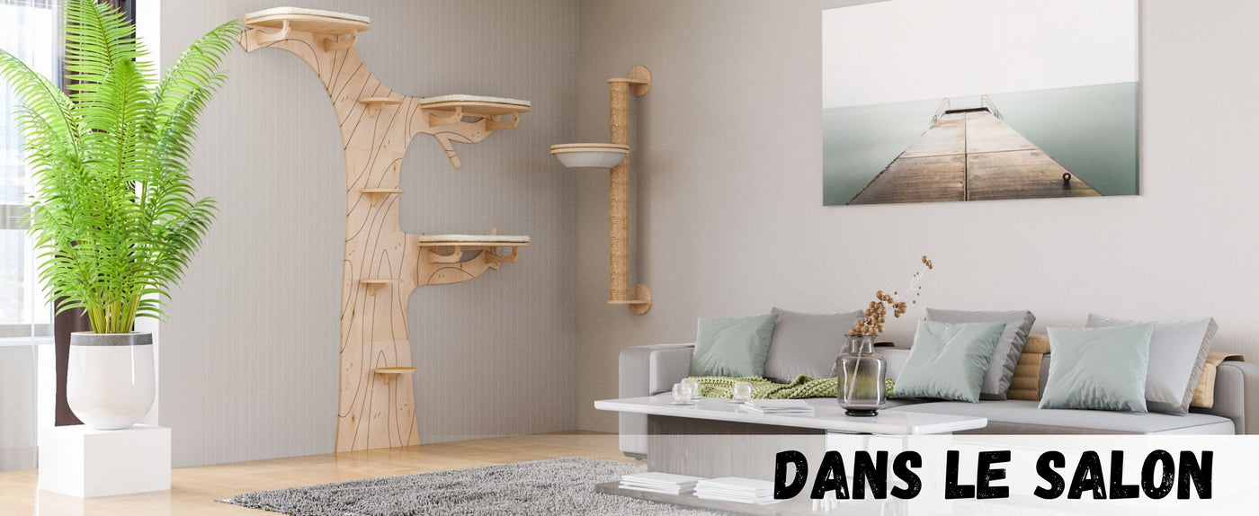 Libérez l'aventurier qui sommeille en votre chat avec cet arbre à chat mural exceptionnel, un système modulaire d'escalade et de détente imitant un arbre en bois stylisé. Il crée un véritable paradis vertical, avec des plateformes confortables équipées de coussins moelleux fixés par velcro, stratégiquement placés pour une escalade sans effort et une détente ultime.