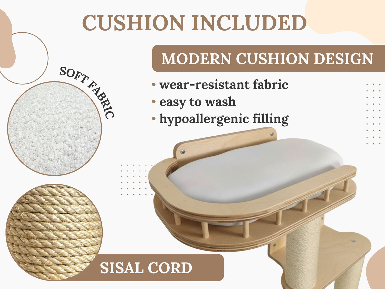 • DIMENSIONS: Shelf-bed with a cushion - length - 16.5" (42 cm) -width - 11.8" (30 cm); Sisal scratching post - 3 sections -height - 41" (105 cm); Small shelf - Width - 10.4" (26 cm).