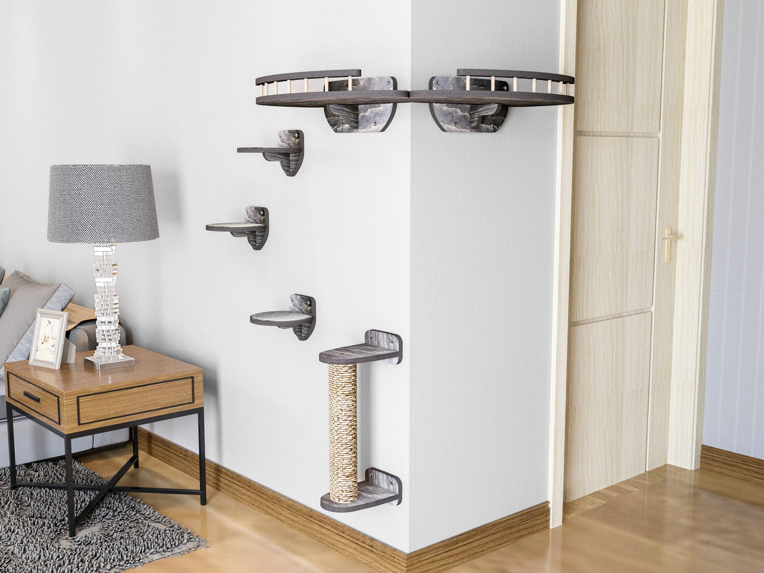 This compact wall-mounted set combines a stylish external corner shelf, sturdy scratching post, and three round steps — perfect for climbing, resting, and exploring.