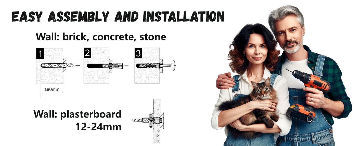 Our cat wall step is designed for easy assembly, requiring no special skills. Each package includes everything you need for assembly and installation, as well as detailed paper instructions that will help you assemble this cat wall shelf-bed.