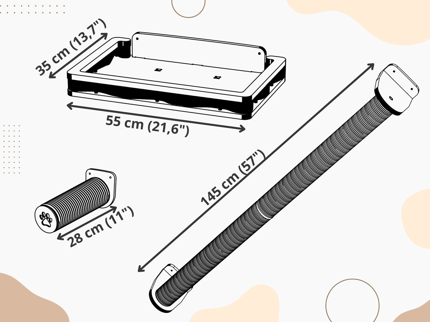 - 3 sisal climbing posts – each 57" (145 cm), made from two 27.5" (70 cm) sections;